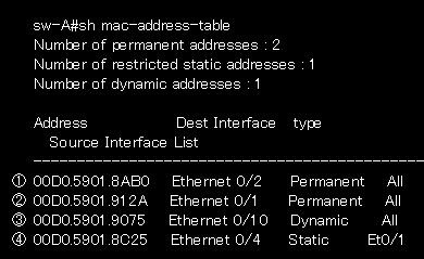 次のようなshow mac-address-tableの出力が表示された場合、しばらく使用しなければエージアウト(破棄)されるのはどれ?