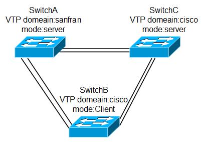 図のようなスイッチドネットワークがあります。SwitchAでMaedaという名前のVLANを新規作成しましたが、ほかの2台のスイッチに反映されていません。考えられる原因はどれ?